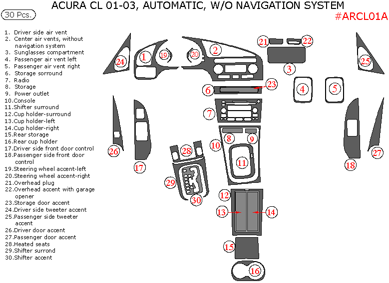Acura CL 2001, 2002, 2003, Interior Kit, Automatic, Without Navigation, 30 Pcs., OEM Match.