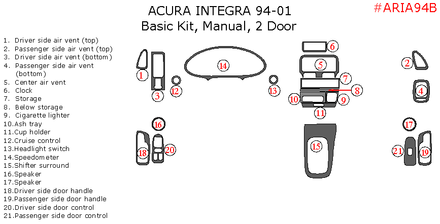 Acura Integra 1994, 1995, 1996, 1997, 1998, 1999, 2000, 2001, 2 Door, Basic Interior Kit, Manual 21 Pcs.