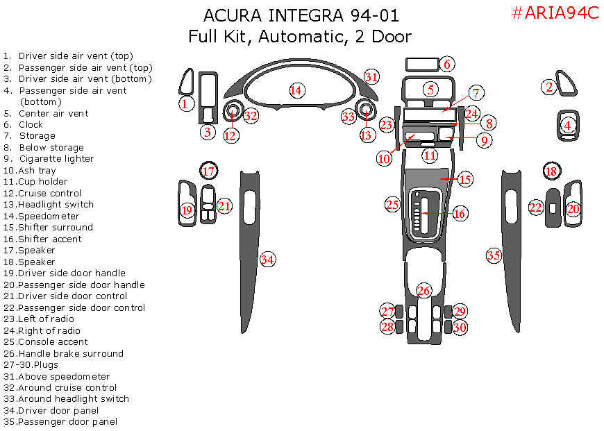 Acura Integra 1994, 1995, 1996, 1997, 1998, 1999, 2000, 2001, 2 Door, Full Interior Kit, Automatic 35 Pcs.
