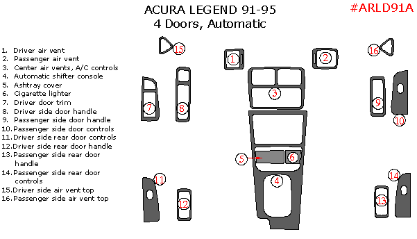 Acura Legend 1991, 1992, 1993, 1994, 1995, Interior Kit, 4 Door Automatic, 16 Pcs.
