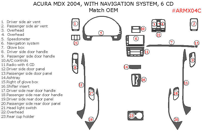 We offer a wide variety of colors and materials of Acura MDX 2004, Interior Dash Kit, With Navigation System, 6CD Changer, 23 Pcs., Match OEM. Choose your favourite option and place an order.