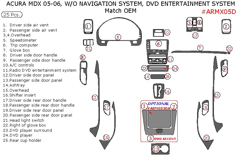 Acura MDX 2005-2006, Interior Kit, Without Navigation System, With DVD Entertainment System, 25 Pcs., OEM Match.