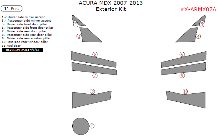 Acura MDX 2007, 2008, 2009, 2010, 2011, 2012, 2013, Exterior Kit, 11 Pcs.