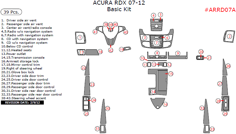We offer a wide variety of colors and materials of Acura RDX 2007, 2008, 2009, 2010, 2011, 2012, Basic Interior Kit, 39 Pcs. Choose your favourite option and place an order.