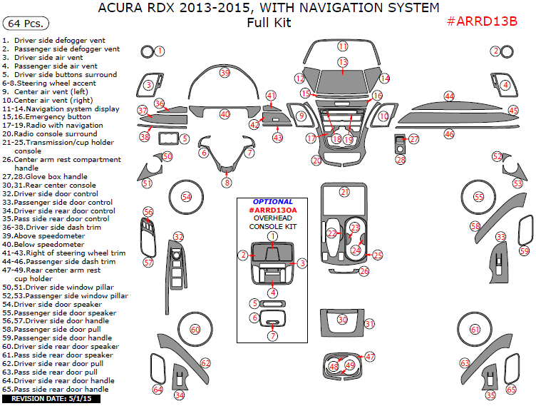 Acura RDX 2013, 2014, 2015, With Navigation System, Full Interior Kit, 64 Pcs.