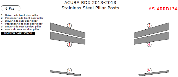 We offer a wide variety of colors and materials of Acura RDX 2013, 2014, 2015, 2016, 2017, 2018, Stainless Steel Pillar Posts, 6 Pcs. Choose your favourite option and place an order.