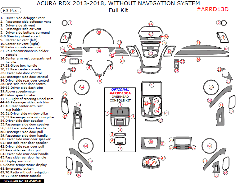 Acura RDX 2013, 2014, 2015, 2016, 2017, 2018, Without Navigation System, Full Interior Kit, 63 Pcs.