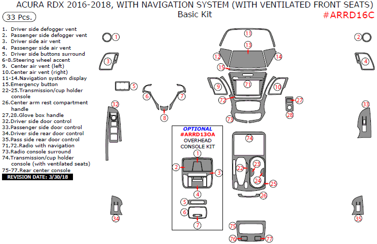Acura RDX 2016, 2017, 2018, With Navigation System (With Ventilated Front Seats), Basic Interior Kit, 33 Pcs.