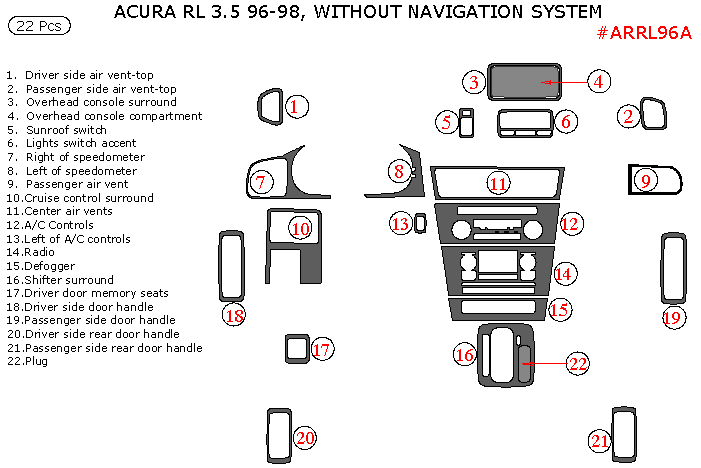 Acura RL 1996, 1997, 1998, Interior Kit, Without Navigation System, 22 Pcs., Match OEM