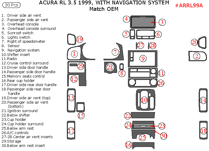 Acura RL 1999, Interior Kit, With Navigation System, 30 Pcs., Match OEM
