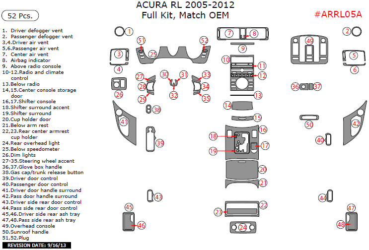 Acura RL 2005, 2006, 2007, 2008, 2009, 2010, 2011, 2012, Full Interior Kit, 52 Pcs., Match OEM