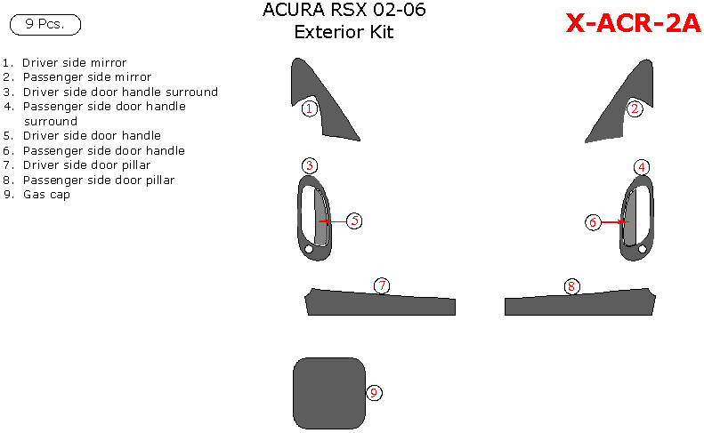 We offer a wide variety of colors and materials of Acura RSX 2002, 2003, 2004, 2005, 2006, Exterior Kit, 7 Pcs. Choose your favourite option and place an order.