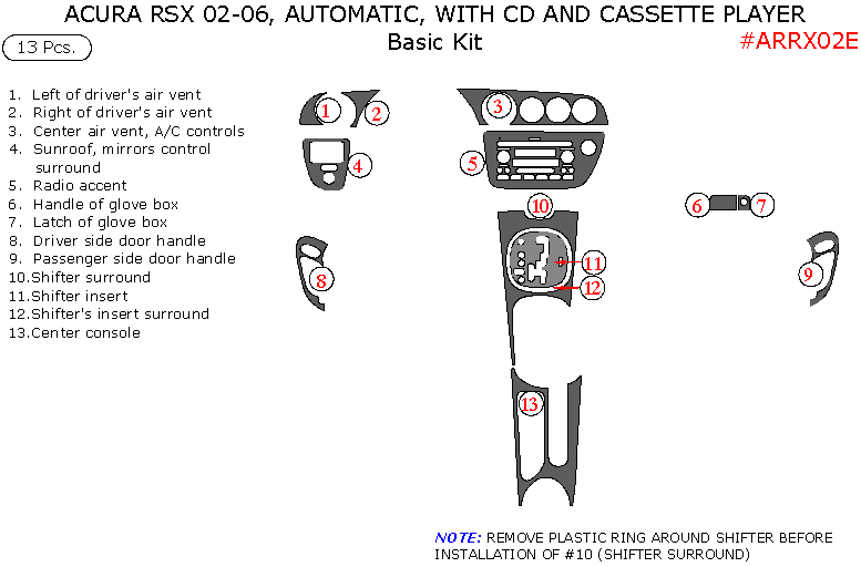 Acura RSX 2002, 2003, 2004, 2005, 2006, Basic Interior Kit, Automatic, With CD and Cassette Player, 13 Pcs.