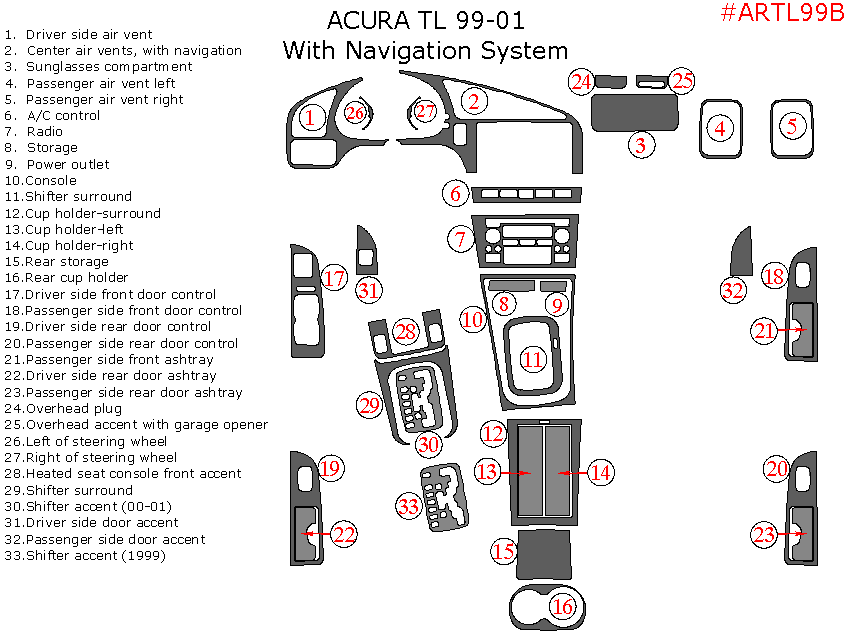 We offer a wide variety of colors and materials of Acura TL 1999, 2000, 2001, Interior Dash Kit, With Navigation, 32 Pcs., Match OEM. Choose your favourite option and place an order.