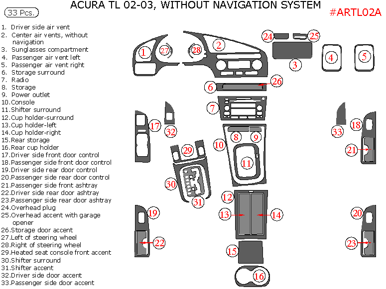 Acura TL 2002-2003, Interior Dash Kit, Without Navigation, 33 Pcs., Match OEM
