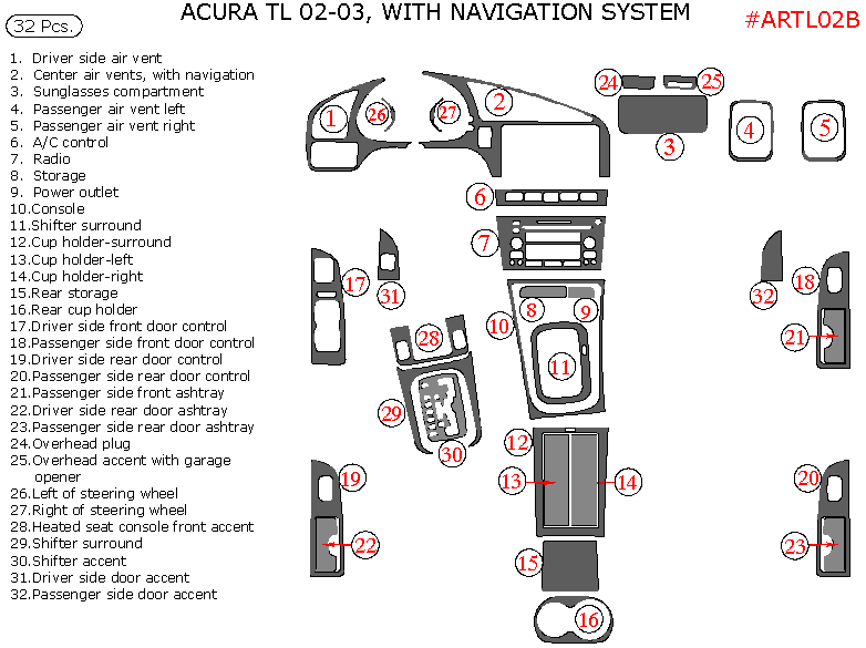 We offer a wide variety of colors and materials of Acura TL 2002-2003, Interior Dash Kit, With Navigation, 32 Pcs., Match OEM. Choose your favourite option and place an order.