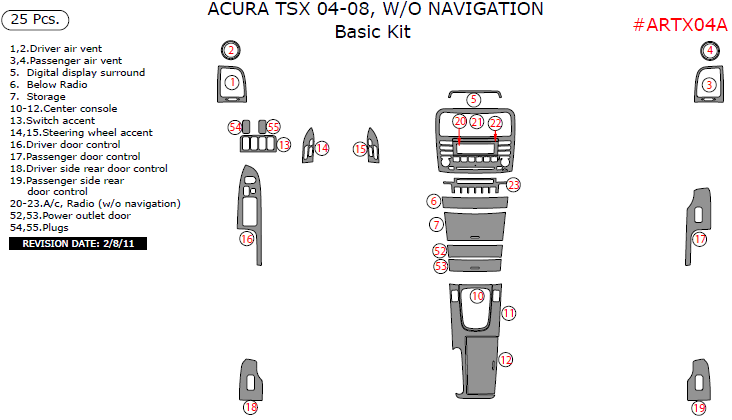 Acura TSX 2004, 2005, 2006, 2007, 2008, Without Navigation, Basic Interior Kit, 25 Pcs.