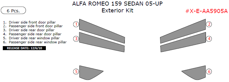 Alfa Romeo 159 2005, 2006, 2007, 2008, 2009, 2010, 2011, 2012, 2013, 2014, 2015, Exterior Kit (Sedan Only), 6 Pcs.