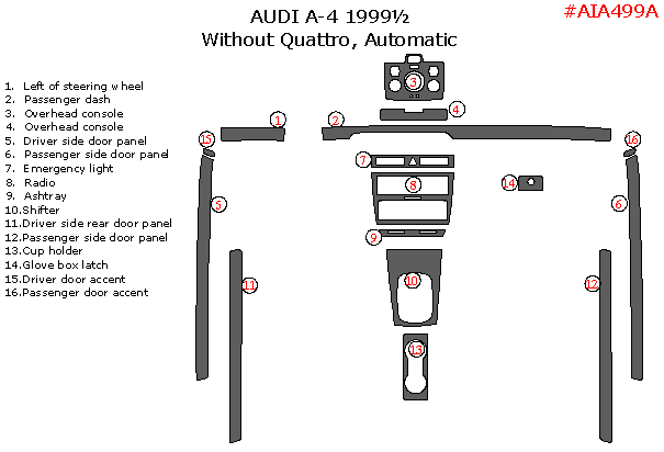 Audi A4 1999.5, Interior Kit, Automatic, Without Quattro, 16 Pcs.