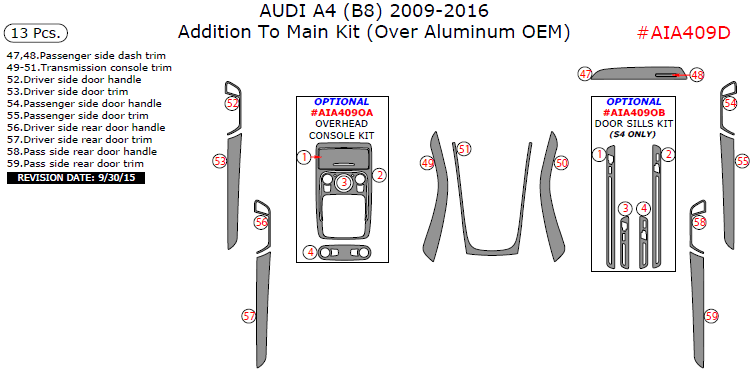 Audi A4 2009, 2010, 2011, 2012, 2013, 2014, 2015, 2016, Addition To Main Interior Kit (Over Aluminum OEM), 13 Pcs.