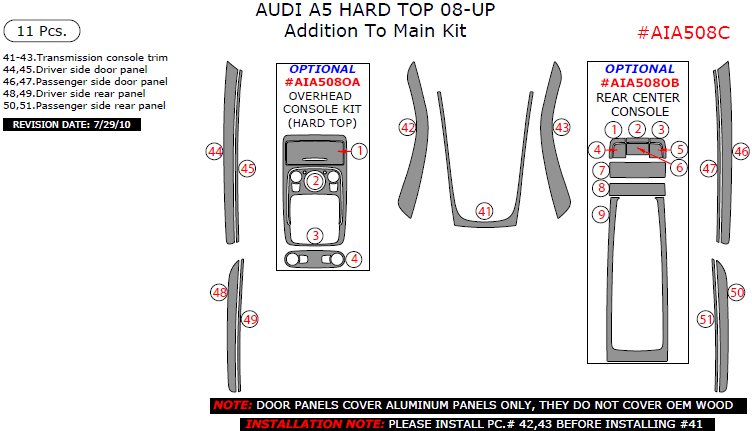 Audi A5 2008, 2009, 2010, 2011, 2012, 2013, 2014, 2015, Addition To Main Interior Kit (Hard Top Only), 11 Pcs.