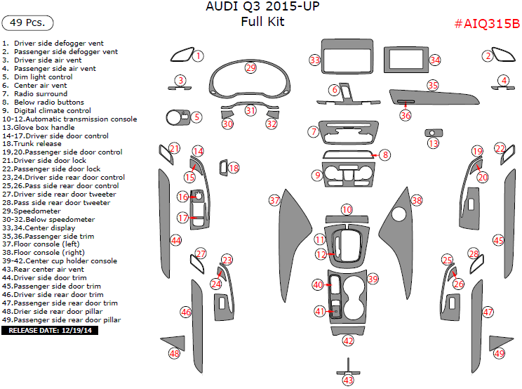 Audi Q3 2015, 2016, 2017, 2018, Full Interior Kit, 49 Pcs.