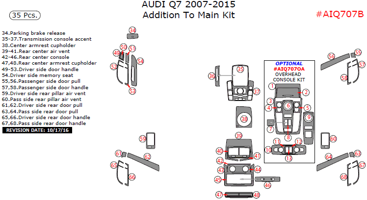 Audi Q7 2007, 2008, 2009, 2010, 2011, 2012, 2013, 2014, 2015, Addition To Main Interior Kit, 35 Pcs.