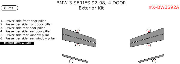 BMW 3 Series 1992, 1993, 1994, 1995, 1996, 1997, 1998, (1992, 1993, 1994, 1995, 1996, 1997, 1998) 4 Door, Exterior Kit, 6 Pcs.