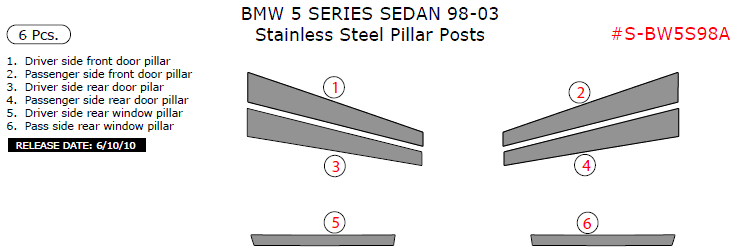BMW 5 Series Sedan 1998, 1999, 2000, 2001, 2002, 2003, Stainless Steel Pillar Posts, 6 Pcs.