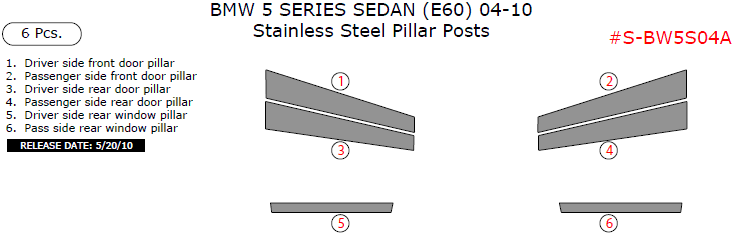 BMW 5 Series Sedan (E60) 2004, 2005, 2006, 2007, 2008, 2009, 2010, Stainless Steel Pillar Posts, 6 Pcs.
