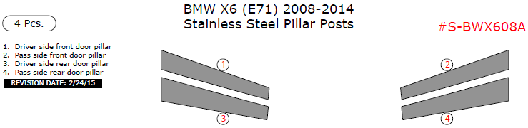 We offer a wide variety of colors and materials of BMW X6 (E71) 2008, 2009, 2010, 2011, 2012, 2013, 2014, Stainless Steel Pillar Posts, 4 Pcs. Choose your favourite option and place an order.