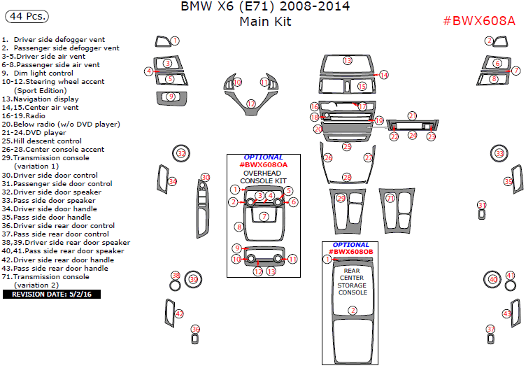 BMW X6 2008, 2009, 2010, 2011, 2012, 2013, 2014, Main Interior Kit, 44 Pcs.