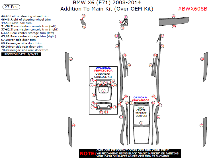 BMW X6 2008, 2009, 2010, 2011, 2012, 2013, 2014, Addition To Main Interior Kit (Over OEM Kit), 27 Pcs.