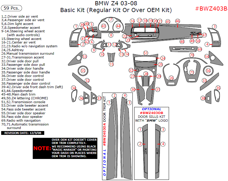 BMW Z4 2003, 2004, 2005, 2006, 2007, 2008, Basic Interior Kit (Regular Kit Or Over OEM Kit), 59 Pcs.
