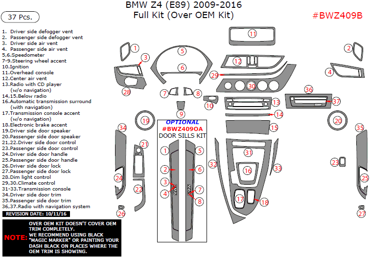 BMW Z4 (E89) 2009, 2010, 2011, 2012, 2013, 2014, 2015, 2016, Full Interior Kit(Over OEM Kit), 37 Pcs.
