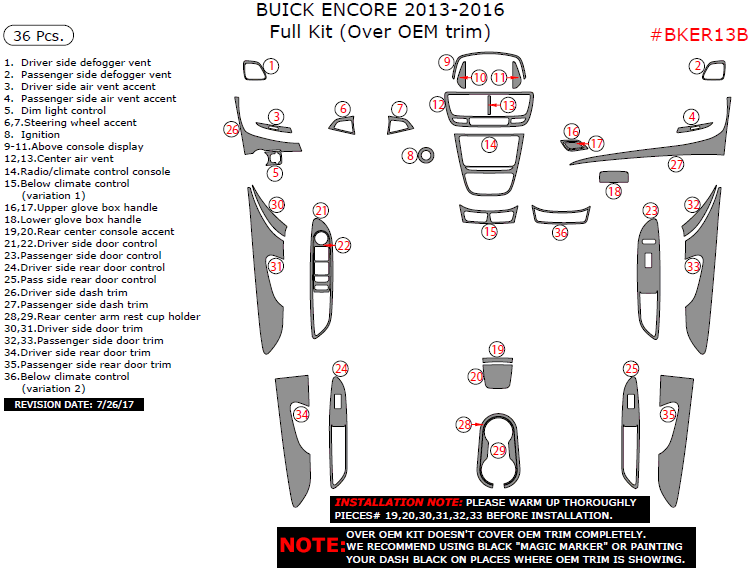 Buick Encore 2013, 2014, 2015, 2016, Full Interior Kit (Over OEM Trim), 36 Pcs.