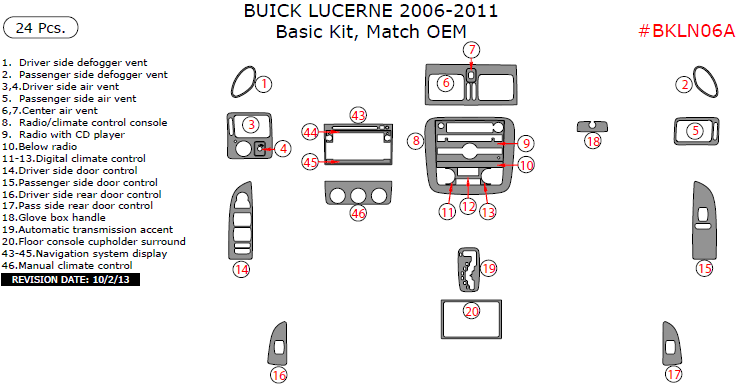 We offer a wide variety of colors and materials of Buick Lucerne 2006, 2007, 2008, 2009, 2010, 2011, Basic Interior Kit, 24 Pcs., Match OEM. Choose your favourite option and place an order.