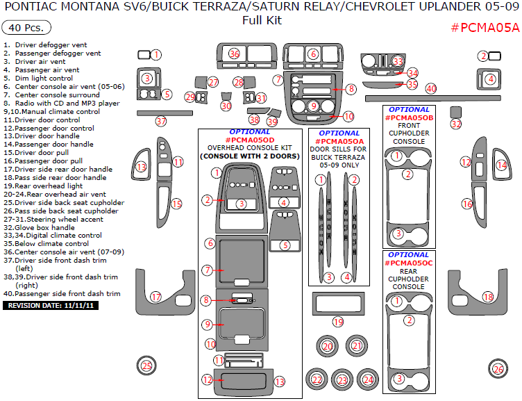 We offer a wide variety of colors and materials of Buick Terraza 2005, 2006, 2007, 2008, 2009, Chevrolet uplander 2005, 2006, 2007, 2008, 2009, Pontiac Montana SV6 2005, 2006, 2007, 2008, 2009, Saturn Relay 2005, 2006, 2007, 2008, 2009, Full Interior Kit, 40 Pcs. Choose your favourite option and place an order.