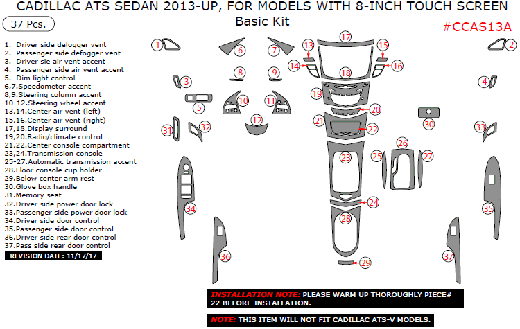 Cadillac ATS Sedan 2013, 2014, 2015, 2017, For Models With 8-Inch Touch Screen, Basic Interior Kit, 37 Pcs.