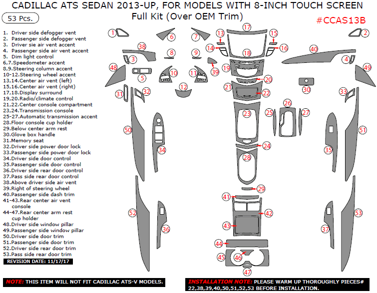Cadillac ATS Sedan 2013, 2014, 2015, 2017, For Models With 8-Inch Touch Screen, Over OEM Trim, Full Interior Kit, 53 Pcs.