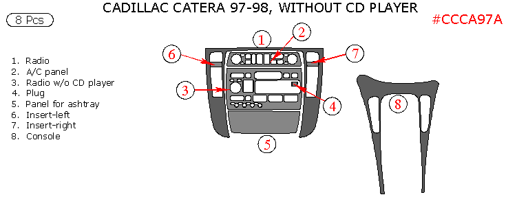 We offer a wide variety of colors and materials of Cadillac Catera 1997, 1998, 1999, Interior Kit, Without CD Player, 8 Pcs., Match OEM. Choose your favourite option and place an order.