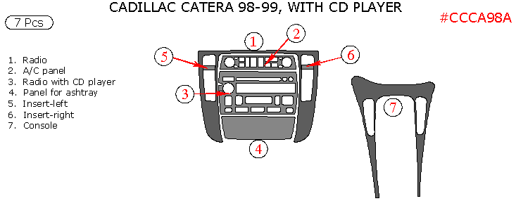 We offer a wide variety of colors and materials of Cadillac Catera 1997, 1998, 1999, Interior Kit, With CD Player, 7 Pcs., Match OEM. Choose your favourite option and place an order.