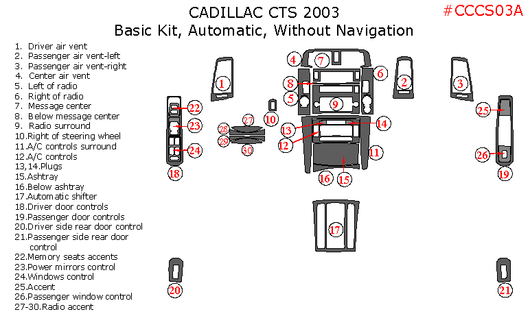 Cadillac CTS 2003, Basic Interior Kit, Automatic, Without Navigation System, 30 Pcs.