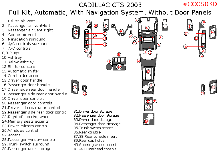 Cadillac CTS 2003, Full Interior Kit, Automatic, With Navigation System, Without Door Panels, 43 Pcs.