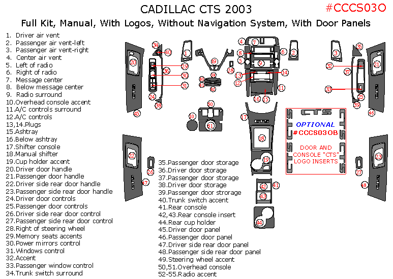 Cadillac CTS 2003, Full Interior Kit, Manual, With Logos, Without Navigation System, With Door Panels, 55 Pcs.