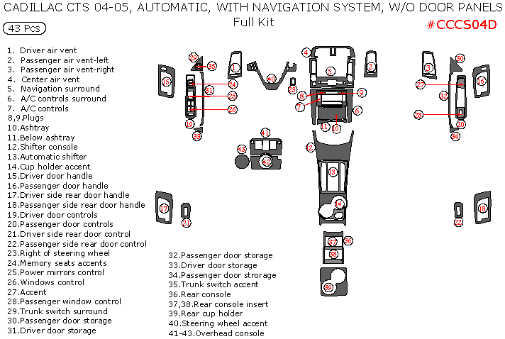 Cadillac CTS 2004-2005, Full Interior Kit, Automatic, With Navigation System, Without Door Panels, 43 Pcs.