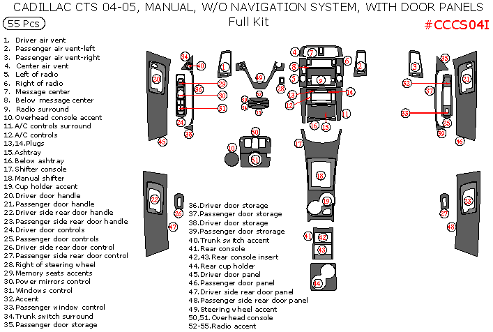 Cadillac CTS 2004-2005, Full Interior Kit, Manual, With Logos, Without Navigation System, With Door Panels, 55 Pcs.