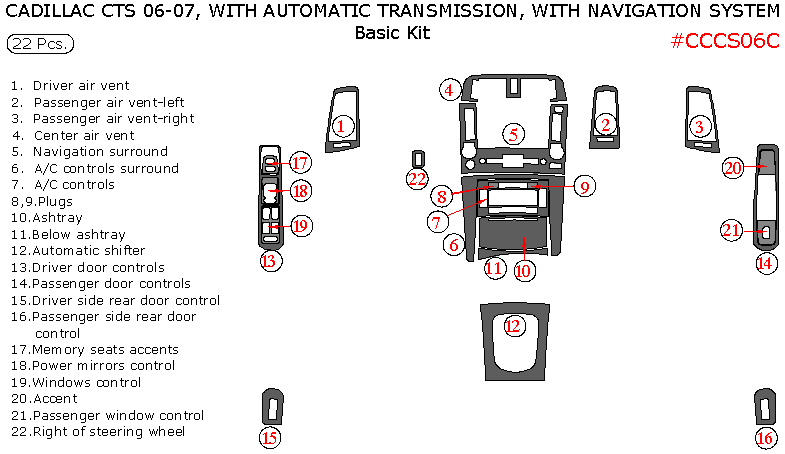 Cadillac CTS 2006-2007, Basic Interior Kit, With Automatic Transmission, With Navigation System, 22 Pcs.