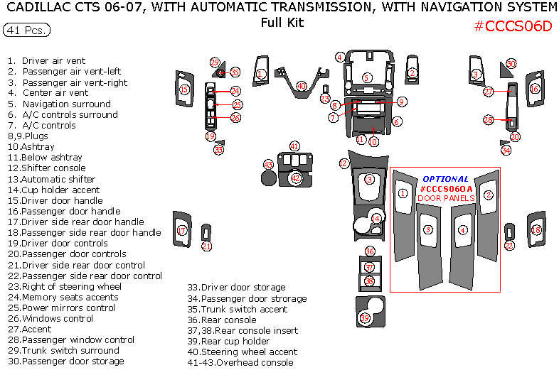 We offer a wide variety of colors and materials of Cadillac CTS 2006-2007, Full Interior Kit, With Automatic Transmission, With Navigation System, 41 Pcs. Choose your favourite option and place an order.