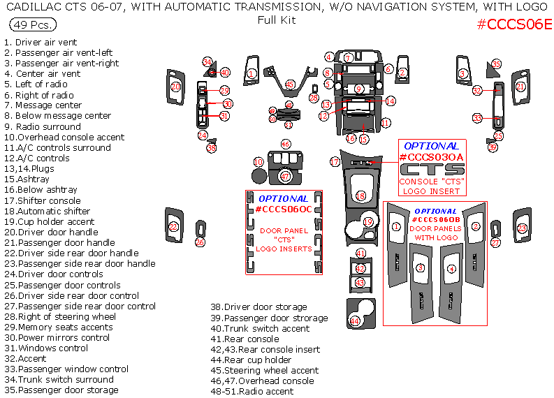 Cadillac CTS 2006-2007, Full Interior Kit, With Automatic Transmission, W/o Navigation System, With Logo, 49 Pcs.